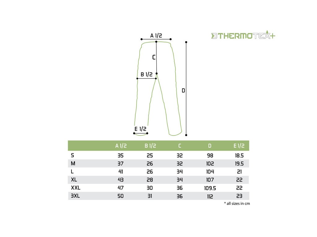 Barevně jsou kalhoty ThermoTEX Plus+ laděny do tmavé zelené a černé barvy se zářivě žlutými prvky, čímž se stanou nejen užitečnou a vysoce funkční, ale také pěknou součástí vašeho outfitu.
