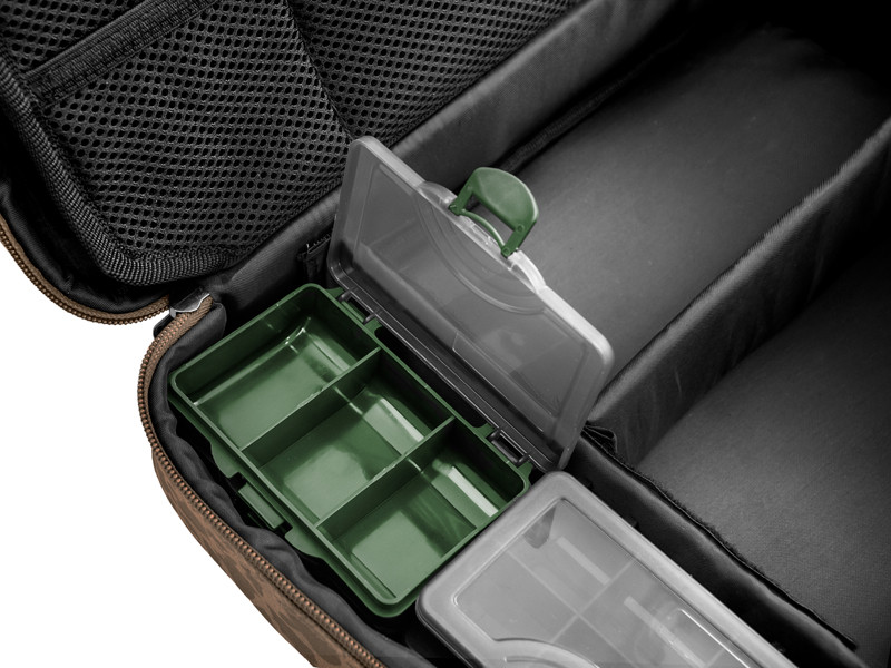 Hlavní přihrádka poskytuje velkorysý prostor pro uložení různé bižuterie, návazcových šňůr a nářadí potřebného k sestavení vašich montáží. Navíc se v ní nacházejí 4 praktické krabičky, ve kterých bude vaše bižuterie vždy v pořádku. Středový panel je opatřen malými síťovými kapsami na jedné straně a velkou síťovou kapsou na straně druhé. Díky tomuto provedení vždy vidíte, co se nachází uvnitř a bez problémů tak najdete vždy tu požadovanou část výbavy. RigStation obsahuje také dvě pěnové plochy sloužící k dokonalému uspořádání a uchycení vašich návazců. Devizou této tašky je také úchop, situovaný v horní části, díky čemuž tašku při transportu nepřevracíte a všechny komponenty v ní jsou tak stále na svém místě. Navíc je vybavena kvalitními zipy s efektními plastovými taháčky. RigStation doplňuje naši sérii pod názvem CARPATH, což jistě potěší všechny příznivce této kamufláže.